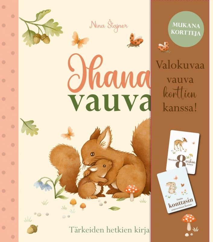 Miltä vauva näytti 4 tai 8 kuukauden iässä ja kun hän hymyili ja ryömi ensimmäisen kerran? Kirjassa on mukana kortteja, joiden kanssa voi valokuvata vauvaa tärkeissä kehitysvaiheissa. Kortit löytyvät kätevästi sivujen sisältä.